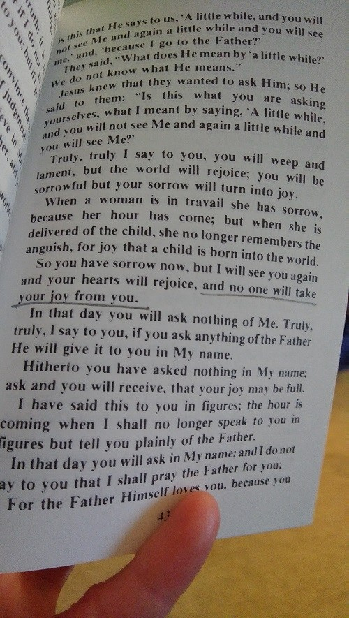 One sentence in the midst of it all suddenly pulled me and I heard, “and no one will take your joy from you.”