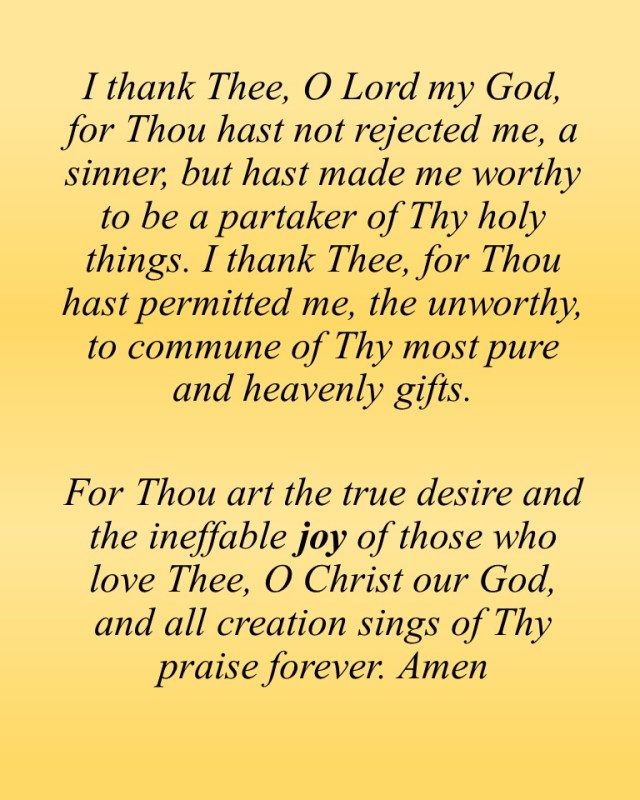 I thank Thee, O Lord my God, for Thou hast not rejected me, a sinner, but hast made me worthy to be a partaker of Thy holy things. I thank Thee, for Thou hast permitted me, the unworthy, to commune of Thy most pure and heavenly gifts. But, O Master, Who lovest mankind, Who for our sake didst die and rise again, and gavest us these awesome and life-creating Mysteries for the good and sanctification of our souls and bodies; let them be for the healing of soul and body, the repelling of every adversary, the illumining of the eyes of my heart, the peace of my spiritual powers, a faith unashamed, a love unfeigned, the fulfilling of wisdom, the observing of Thy commandments, the receiving of Thy Divine Grace, and the attaining of Thy kingdom. Preserved by them in Thy holiness, may I always remember Thy Grace and live not for myself alone, but for Thee, our Master and Benefactor. May I pass from this life in the hope of eternal life, and so attain to the everlasting rest, where the voice of those who feast is unceasing, and the gladness of those who behold the goodness of Thy countenance is unending. For Thou art the true desire and the ineffable joy of those who love Thee, O Christ our God, and all creation sings of Thy praise forever. Amen