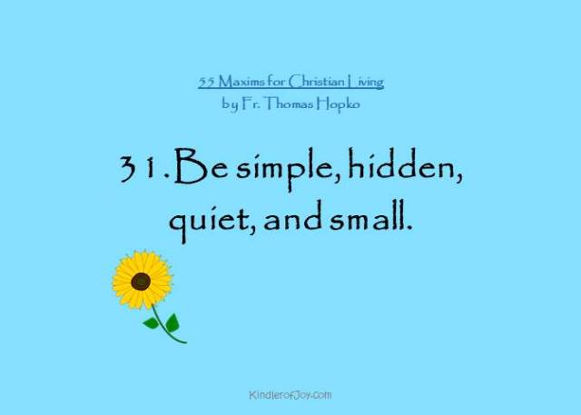 I’ve been mulling this over in my mind. What exactly does it mean to be simple, hidden, quiet and small? My first inclination is to say “don’t bring attention to yourself.” And I think to a certain extent it does mean that, but I think Fr. Thomas had something a little different in mind because he has “Don’t bring attention to yourself” as a completely separate maxim.
