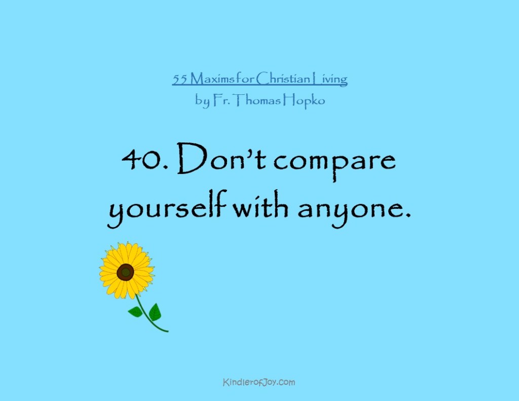 About a year ago I wrote a post titled “Comparing“. At the time I was reading a book called “Garden in the East: The Spiritual Life of the Body” written by Angela Doll Carlson. She had a section in the book on comparing and it was something I could really relate to. The post would have been perfect for this Maxim, had I thought ahead about it. You can read the post by following the link above.