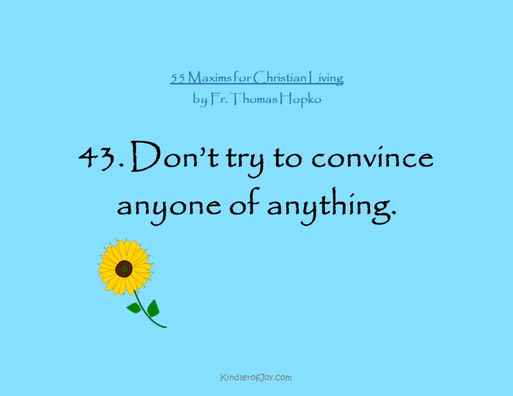 In number forty-three of these Maxims for Christian Living I can’t help but think of my children and my duty of raising them up in the Lord. I, more often then not, bear bad witness to them and then we try desperately to convince them our way is the best way. In reality, most especially now that they are older and needing to make their own decisions, needing to claim our faith for themselves, we just need to bear witness of love and joy to them. Acceptance and empathy would go a very long way. Not with so many words but by our actions.