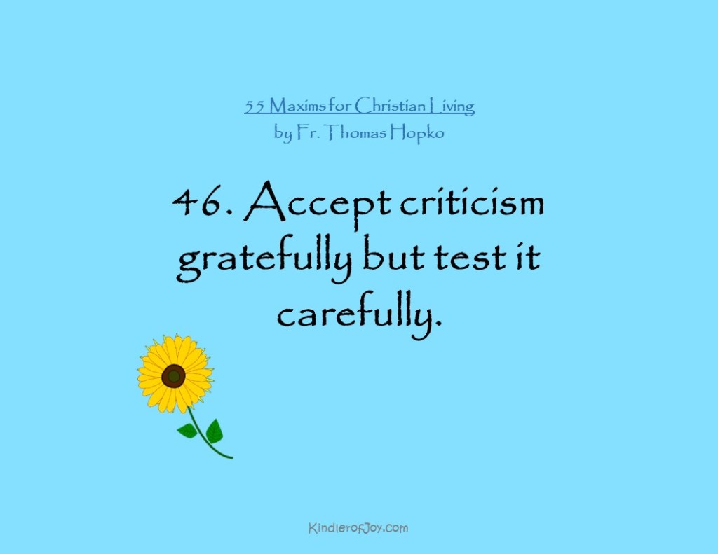 Accept criticism gratefully but test it carefully. We are not obliged to put into practice every criticism that’s given to us. Sometimes the criticism is false. But we certainly must welcome it, be grateful for it, test it. And St. John Chrysostom said, even when we’re accused of something, even if we think it’s not true, we should accept the criticism as true and put it into practice then we’ll never go wrong. Because if our accuser is right, we have repented, and we have pleased them. If they’re not right, we put them to shame.