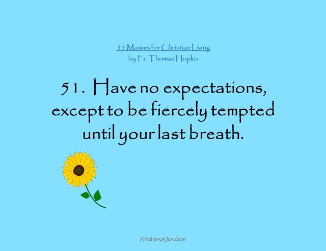 Have no expectations, except to be fiercely tempted to your very last breath. St. Anthony said it. He said: “A truly wise person knows the difference between right and wrong, good and bad, true and false and clings fiercely to what is good, true, and beautiful, but fully expects to be tested, to be tried, and to be tempted til his very last breath.” He said that without being tempted, no one can enter God’s Kingdom—without temptation, no salvation. The whole life of a man on Earth is a trial, according to Scripture. Job said it. So we are being tried every moment, we should expect it. We should never expect the trial to go away. We don’t ask God to take our crosses away. We ask for the power to carry them. God doesn’t tempt anybody. But in the providence of God, we are tested all the time so that our salvation can be ours, and that we could be victorious by the victory of Christ.