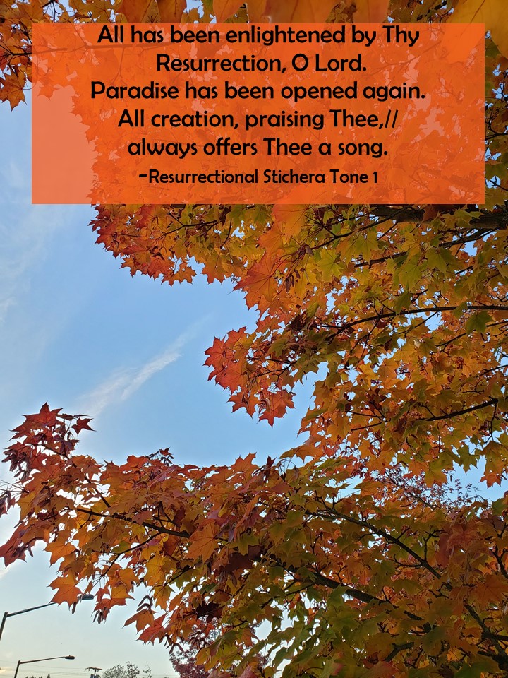 The hymn this choir sings (starting at about 40 seconds) is the exact hymn we sing at our church when we do Resurrectional Vigils. This is the hymn I always think of when I take my walks and am inspired by the beauty.
