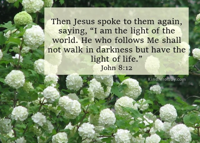 If we follow Him we shall not walk in darkness but have the light of life! Light! When I think of light I think of beauty. I, for one, do not like darkness. In the least! When I was quite young I had at least two incidences that involved terrifying things happening in the darkness.