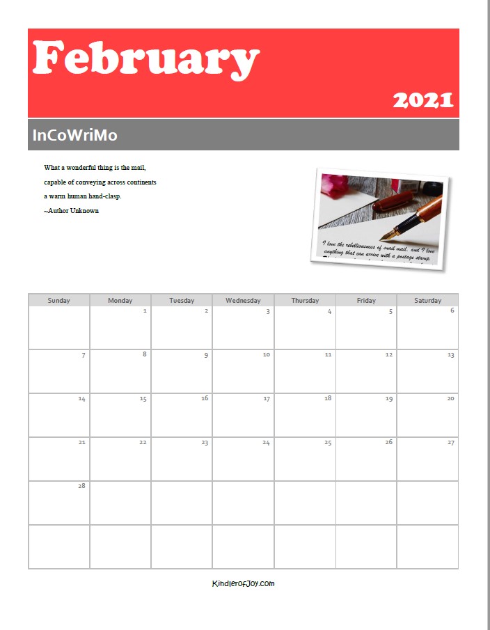 The InCoWriMo website is offering a printable planning calendar for your February writing month. You can go to their page and see their cute little calendar or if you are interested I created one here.